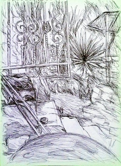 Am späten Nachmittag zeichnete ich den Eingangsbereich unseres Hauses mit dem Tischchen samt Kaffeebecher, Brille und Stiften, der Treppe mit dem Holzblock und den Besenstielen, dem schmiedeeisernen Gitter mit Badezeug und der Überdachung, der Pinie und anderem Grün dahinter, auch ein Stück der Überdachung für das Auto und die Nase desselben.