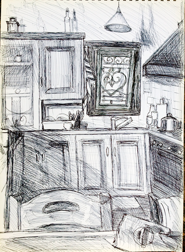 Muss man nicht merken – die Absicht. Die Küche ist etwas krumm und schief gezeichnet, in Wirklichkeit aber ist sie gradllinig. Und das nervte mich beim Zeichnen.
