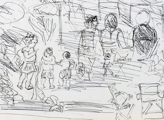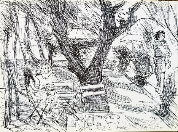 Dort saß ich heute etwas über eine Stunde, auf meinen Mann wartend, trank meinen Zitronensaft, meinen Espresso auch, und skizzierte ein wenig. Meine schwarzen Stifte hatten wenig Farbe, ich versuchte mit Bleistift nachzuhelfen. Da trat eine lange nicht gesehene Freundin an mein Tischchen, mich zu begrüßen. „Hast du einen schwarzen Kuli?“ fragte ich, und sie eilte, mir einen zu beschaffen. Daher ist die zweite Skizze kräftiger als die erste geworden. Danke, Christina!