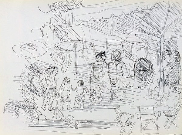 Sehr lebhaft finde ich, was diese beiden Zeichnungen einfangen, liebe Gerda, eine Pause vom Straßenleben, aber keine Pause im zwischenmenschlichen Austausch. Das ganze strahlt durch die Farben eine sommerliche Fröhlichkeit aus, ansteckend.