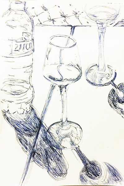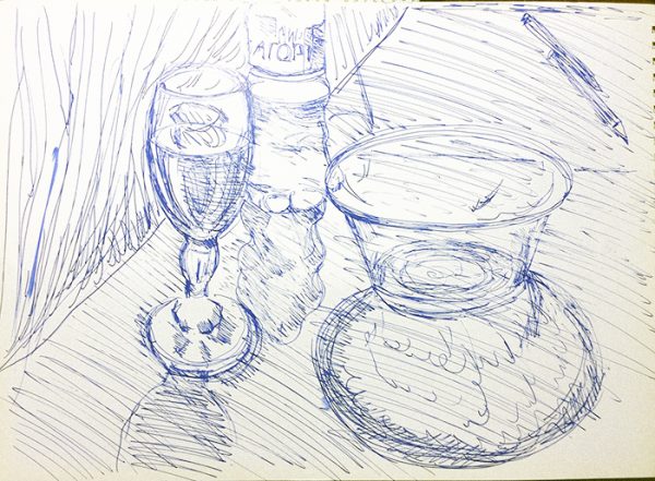 Ich aber tue so, als wäre nichts wichtiger als noch mal ein paar Gläser, Wasser- und Weinflaschen und dann und wann auch meinen Liebsten zu zeichnen, wenn wir abends auf der Turmterrasse sitzen, der eine bei Lampenlicht von oben lesend, die andere zeichnend.