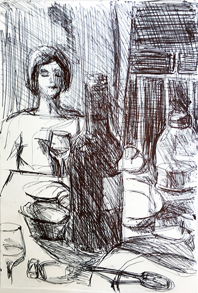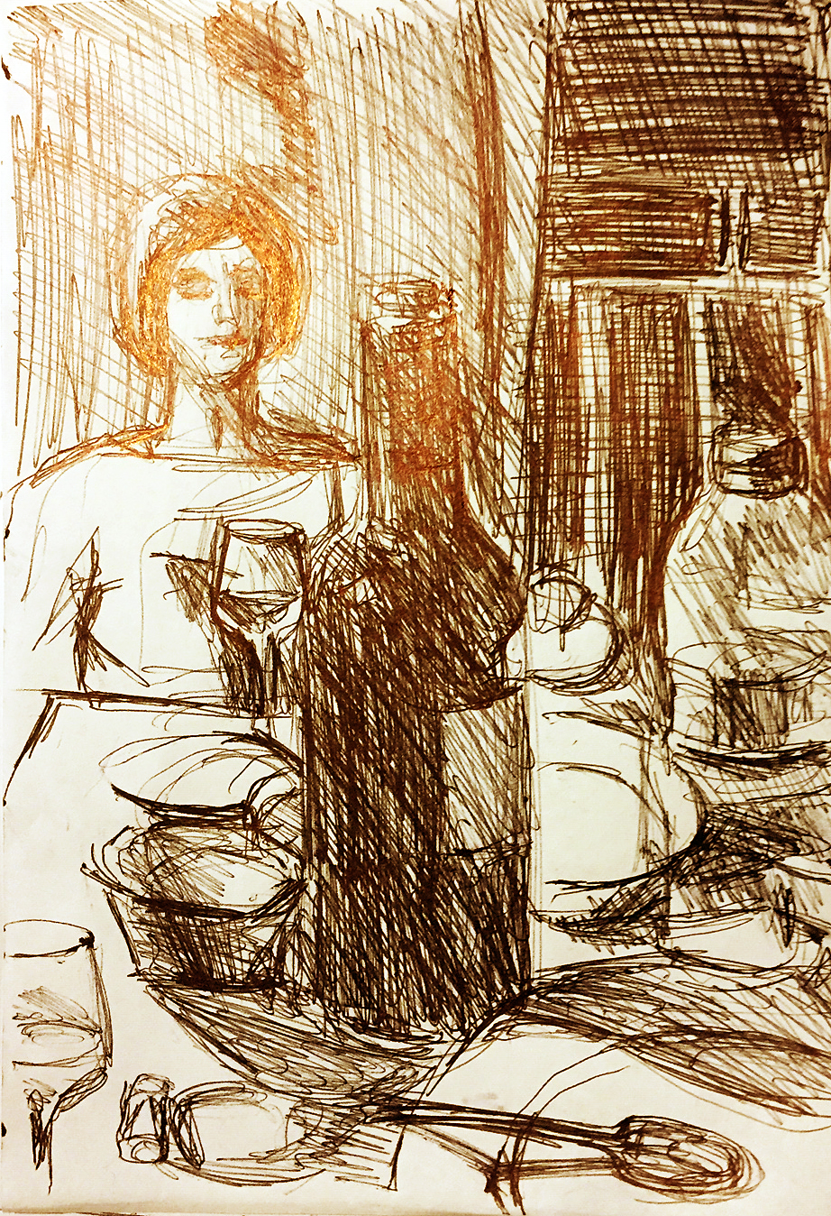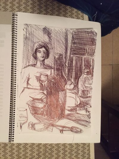 Ich frage normalerweise nicht, wenn ich jemanden zeichne, sondern versuche, es heimlich zu tun. auch in diesem Fall. Ich glaube nicht, dass sie es merkte. Wenn hier jemand gehemmt war, dann ich, denn ich wollte keine Aufmerksamkeit auf mich ziehen. Natürlich sahen die anderen, dass ich zeichnete, aber ich schien nur an den Flaschen etc interessiert zu sein. Dass ich auch die Dame zeichnete, wurde wohl nicht bemerkt. So mache ich es oft.