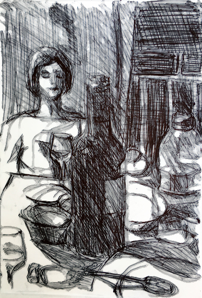 Gestern kamen uns zwei Frauen besuchen, die sich für eine Sommerfrische im Nachbarhaus einquartiert haben. Ihren rundmopsigen Hund Nina brachten sie auch mit. Mein Mann hatte Spagetti mit Krabben gemacht, dazu servierten wir einen kühlen Weißwein und was der Kühlschank sonst noch hergab: Oliven, Schafskäse, Weintrauben, Pfirsiche, Aprikosen. Als die Unterhaltung aufs Beruflich-Politische zusteuerte (beide Frauen arbeiten in einem staatlichen Forschungsinsitut und rätseln über die Veränderungen, die durch den Regierungswechsel zu erwarten sind), schaltete ich auf Zeichnen um. Eine Skizze mit der einen etwas entfernter sitzenden Besucherin kam zustande. Mehr traute ich mich nicht.