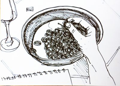 Meine Hand mit blauen Trauben (Zeichnungen mit Filzstift und Kuli: blind, sehend, gepaust, bearbeitet).
