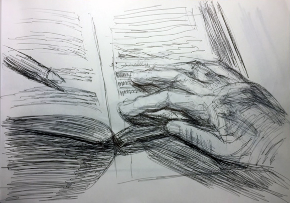 Dann legte ich meine Hand auf ein dickes aufgeschlagenes Buch und zeichnete beides.