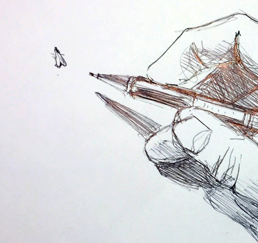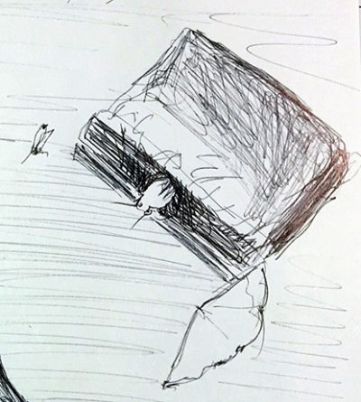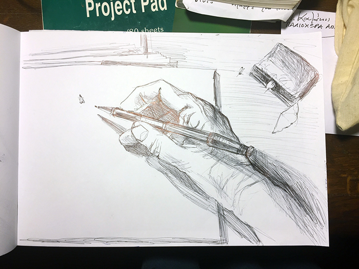 Bei der zweiten Zeichnung war ich schlauer. Ich beschränkte mich darauf, mit der Linken die Rechte zu zeichnen und alles drum herum auf Distanz zu halten. Nur eine winzige Motte verirrte sich aufs Blatt.