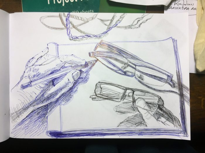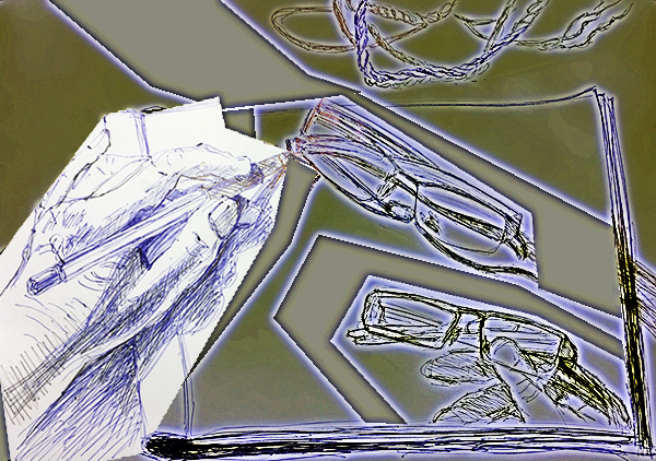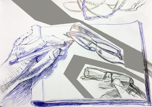 Bei der ersten hatte ich die Idee, mit der ungeübten rechten meine linke Hand zu zeichnen, die ihrerseits meine Brille zeichnet. Die Hand, die ich mit blauem Kuli skizzierte, geriet mir recht lebendig. Doch die Brille, die die Hand mit schwarzem Kuli zeichnete: o weh! „Zu groß, zu starr“, tadelte ich sie, aber da war es schon geschehen. Was tun? Vielleicht brauchte sie ein wenig Nachhilfeunterricht? Ich nahm die Brille in meine rechte Hand und demonstrierte mit der Linken, wie die richtigen Proportionen gewesen wären. Blau und schwarz mischte ich, überging auch die erste Brille mit Blau und setzte ein Stück Schnur dazu, hoffend, dadurch die Zeichnung zu retten.