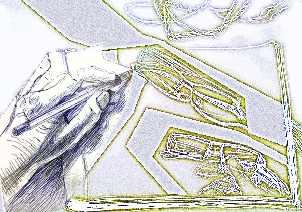 Zeichnende und gezeichnete Hand, Brille, Insekt (Subjekt-Objekt, Bildaufbau)