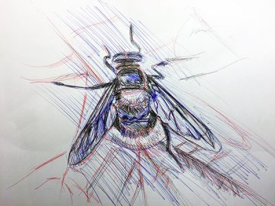 Aber wir menschlichen Kleinkünstler können es nicht lassen! Und so tat ich gestern Nacht, was mir schon lange in den Fingern zuckt: eines von Gerhards Insekten zu zeichnen. Normalerweise zeichne ich nicht nach Fotos, aber eine Ausnahme durfte sein. Ich nutzte die Gelegenheit, erstmals drei Kulis verschiedener Farbe (schwarz, blau, rot) zu kombinieren. Das Zeichnen gab mir Zeit, das wunderbare Insekt, das Gerhard kunstvoll abgelichtet hatte, sorgfältiger zu betrachten. Und genau das – sorgfältig hinschauen und nicht bloß husch husch einen Blick werfen – war auch der Zweck des Unterfangens. (Das Foto findest du im oben angegebenen link)