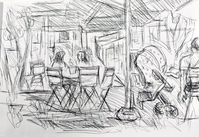 Heute hatte ich in der Stadt Kalamata zu tun und gönnte mir eine Pause im Gartencafe Στολίδι („Schmuckstück“). Ich traute mich auch, ein paar schnelle Skizzen von den Gästen zu machen: 1) rechts im Bild ein Kinderwagen mit dem Bein des Kindes und dem Rücken des Papas, gegen links zwei entferner sitzende Frauen. 2) Zu diesen gehören vier lebhafte Buben, die zu meiner Freude weder Spielzeug noch Monitur herumschleppen, sondern erfindungsreich miteinander spielen, mal unter sich, mal bei den zwei Frauen. 3) Drei Frauen im Gespräch, rechts der Tisch mit einer der Mütter und zwei Buben, darüber zwei Bedienstete, die sich kurz ausruhen.