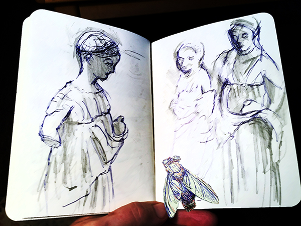 gezeichnete zweifarbige Fliege auf Skizzenbuch mit Skizzen aus Braubron