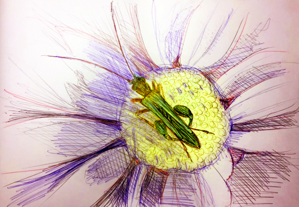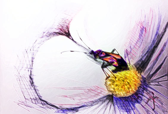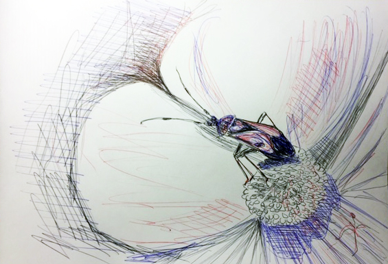 Ein zweites Mal wilderte ich in Gerhards Blog auf der Suche nach Insekten, die ich nachzeichnen könnte. Sie sollten in ihrer ganzen Gestalt zu sehen und nicht zu winzig sein. Als erste stach mir die „schöne Wanze“ ins Auge.