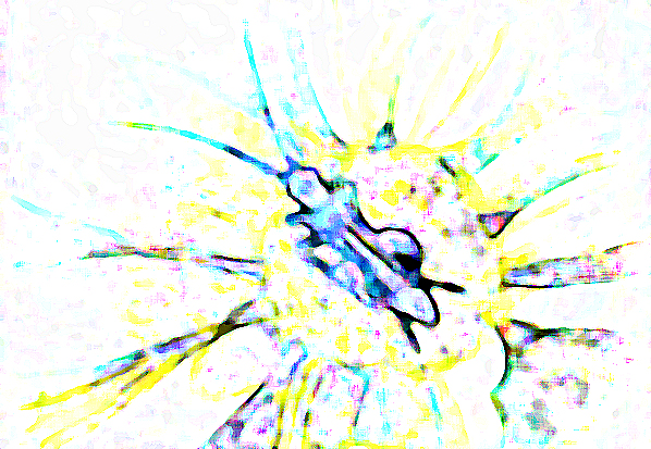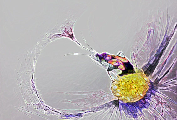 Toll, wie du das Sehen der Insekten durch Kraftfelder und Facetten angedeutet hast. Wenn du das eine Bild ganz leicht mit einem Raster von Verpixelung überziehst, verlagerst du die Facettenaugen vom Insekt zur Betrachterin, machst also mich zum Insekt, einem ziemlich großen im Verhältnis zum kleinen Weichkäfer. Ich denke gerade darüber nach, wie man die Betrachterin zu einem sehr kleinen Insekt machen könnte …