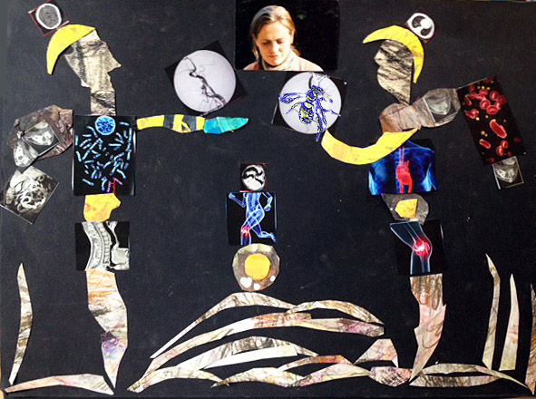 Große Wollbiene (3-Farb-Zeichnung, gelb gehöht, Bearbeitungen, Foto-Collagen