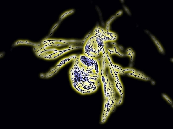 Große Wollbiene (3-Farb-Zeichnung, gelb gehöht, Bearbeitungen, Foto-Collagen