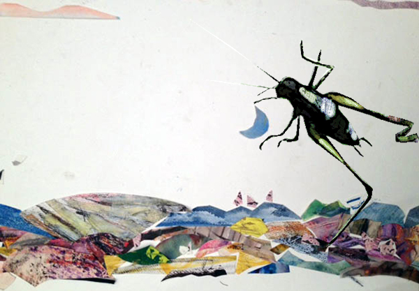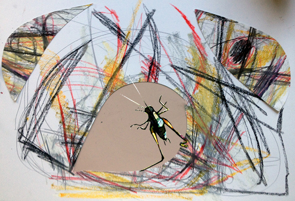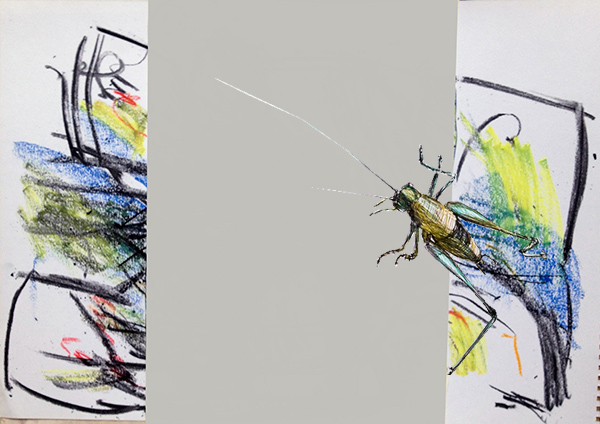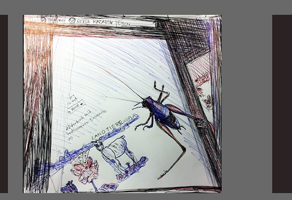 Von den dortigen Fotos musste ich eines auswählen – aber welches? Dieser Hüpfer ist so vielgestaltig! Eigentlich müsste ich zehn Zeichnungen übereinander setzen, um ihm einigermaßen gerecht zu werden. Vielleicht mache ich das auch mal, aber noch bin ich bei der einfachen Ausführung: abgegrenztes Tier auf Hintergrund. In diesem Fall ist das Insekt sogar extrem abgegrenzt, denn es hockt auf der beleuchteten Mattscheibe des Computers, auf der Susannes „Landtiere“ erscheinen – ein Büchlein, das ich übrigens hoch schätze und „im wirklichen Leben“ neben dem Computer liegen habe, mich immer wieder an der Ziege, der Kuh und dem Schmetterling auf der roten Blume erfreuend. Auf meiner Skizze sind sie leider ziemlich krüppelig geworden . …