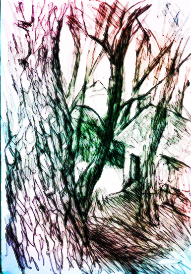 ← Häuschen im Wald (Zeichnung, zwei Mal fotografiert und bearbeitet, 2019-09-18)