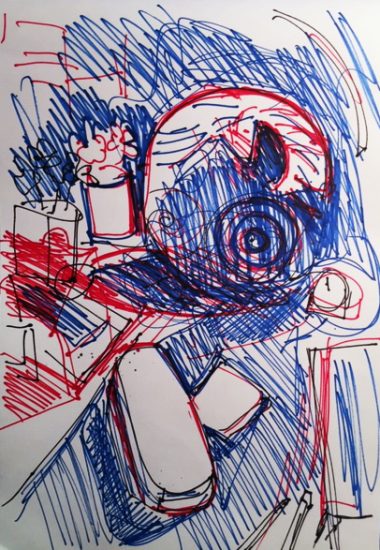 ← 3-farbig mit Filzstiften. Neue Experimente (Skizzen von Schreibtisch und Blumentopf, Bearbeitungen)