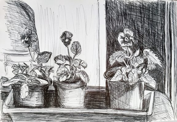 Sind sie nicht reizend? Stiefmütterchen, Obst und halbierte Zitrone (drei Zeichnungen)