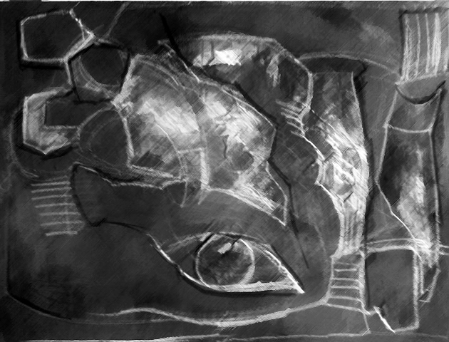 Bruchstücke, die noch konkreter erkennbar sind, in der ersten Arbeit noch erkennbar, das entsetzt starrende Auge erinnert mich an Guernica. Die Farbe, die du dem Original entzogen hast, enthielt noch so kranke Fleischtöne, die sehe ich auch in der schwarzweißen Fassung mit, nachdem ich sie einmal entdeckt habe.