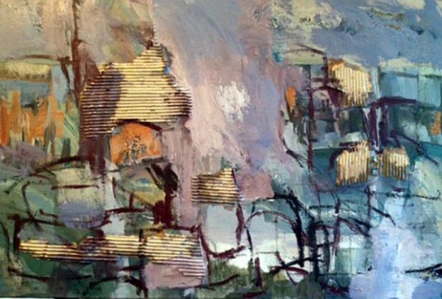 Gemälde, eingeklebte Papiere und Wellpappe übermalt