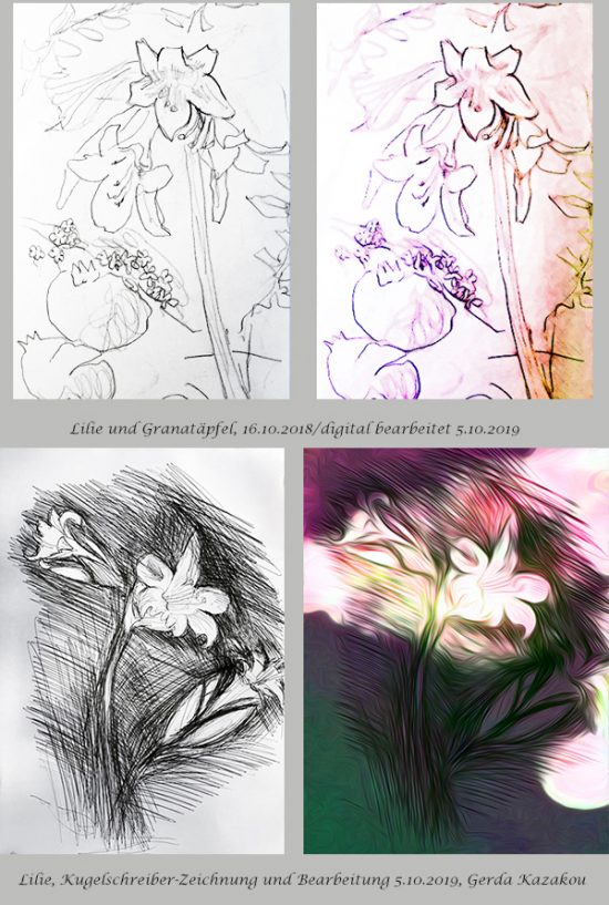 Heute morgen beeilte ich mich, vorr dem Regen die Lilie zu fotografieren, die ich vor zwei Tagen zeichnete. Sie wächst unterhalb des Granatapfelbaums, füür mich gehören die beiden eng zusammen, aber es ist nicht leicht, sie zusammen auf ein Bild zu bekommen. Beim Fotografieren – denn beim Zeichnen ist es natürlich kein Problem (die obere Zeichnung stammt aus dem Vorjahr).