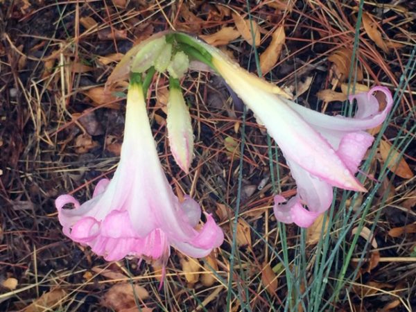 Liebe Ule, ich sah sie erstmals vor zwei Jahren, sie hat sich ohne mein Zutun in meinem Garten angesiedelt. Ich gehe davon aus, dass es eine Lilie ist. Inzwischen sind vier Blüten am selben Stiel aufgegangen, und es gibt immer noch Knospen. Der Regen hat auch diese Blüten ein wenig gezaust, aber sie halten sich wacker, und ich staune sie täglich an.