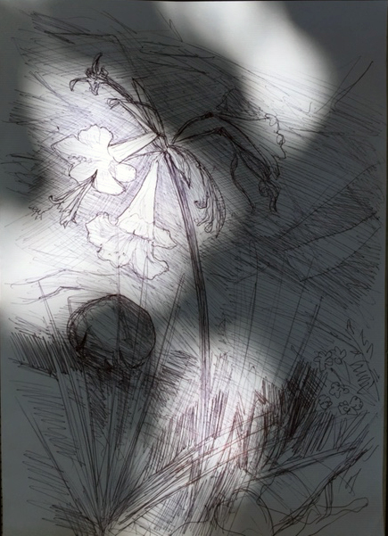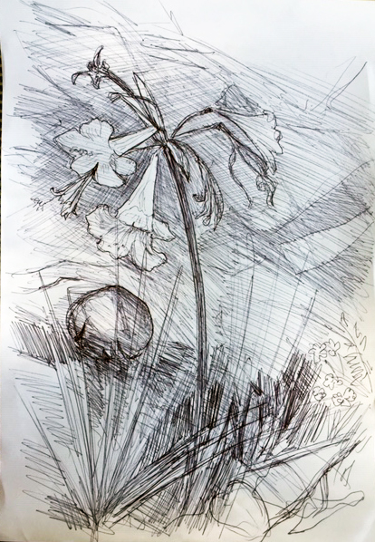 Wie plastisch die neue Zeichnung mit den starken Lichtflecken wirkt, liebe Gerda! Eigentlich müsste ich ja von Schattenflecken sprechen, aber sie scheinen hier fast die Grundebene zu bilden. Dein Lilienprotokoll finde ich gut: es zeigt wie lange und energiereich diese magere Pflanze ihre Blüten treibt.