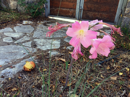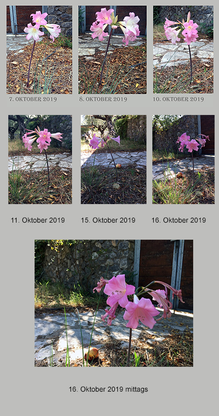 Zweieinhalb Tage war ich in Athen. Kaum zurück in der Mani, fotografierte ich erneut meine Lilie, deren verwelkte Blüten nun zahlreicher sind als die neu sich öffnenden. Am Boden ein zerfallender Granatapfel.