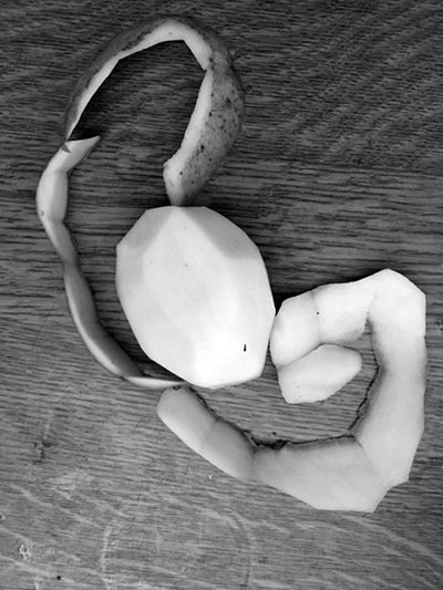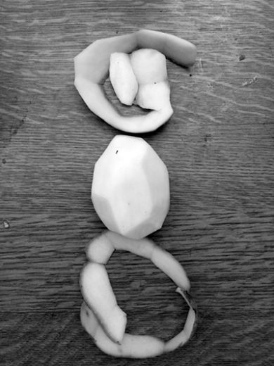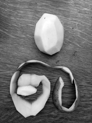 Wenn meine Großmutter Kartoffeln schälte, haben wir uns immer hingehockt, den entstehenden „Schlangen“ zugeschaut und gebettelt “ Erzähl uns eine Geschichte“,Dann fingen wir einige der dünnen schlangenartigen Schalen auf , spießten sie auf eine Stricknadel …und dann konnten sie auf der Heizung tanzen ..(.gleichmäßige leichte Wärme von unten)…ich glaube mit einem Kartoffelfuß als Stand“bein“ (?) Diese Idee kam von meinem sonst sehr nüchternen Ingenieur-Großvater….