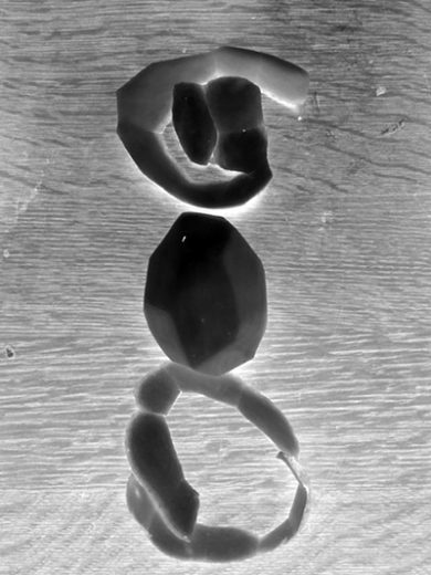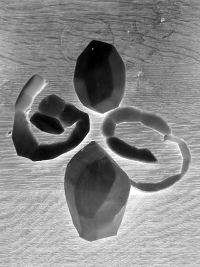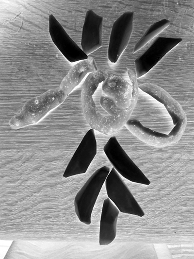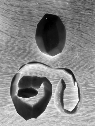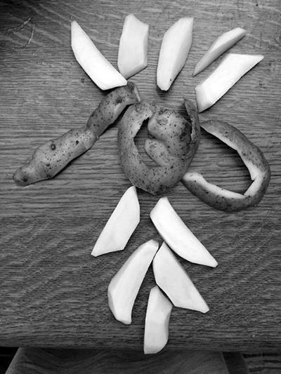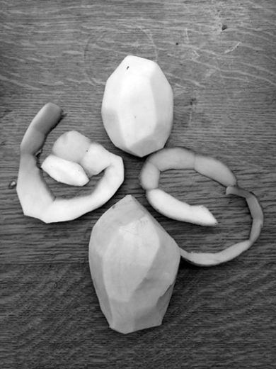 Tatsächlich werden die Kartoffelteile in der seltsamen Beleuchtung und dem schwarzweißen Gegensatz mit Bedeutung erfüllt, die sich als künstlerische Form tatsächlich lesen lässt. Im Schritt zurück erkenne ich sie dann auch im unveränderten Foto – aber kaum vorher. Klasse!