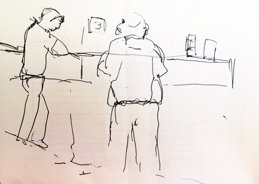 Skizzen von unterwegs (Gläser und Karaffe, medizinisches Untersuchungszentrum, Bahnhofsmuseum, Tavernen-Katze)
