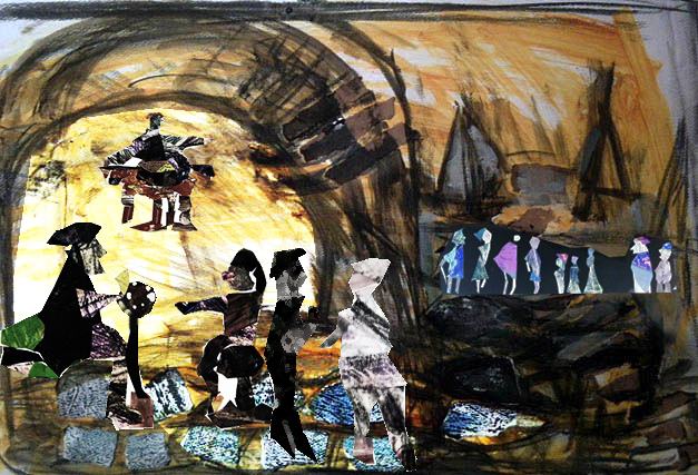 „Hafenszene“. Pigmente, bemalte Papieren auf Pappe, durch digital ausgeschnittene Legefiguren belebt