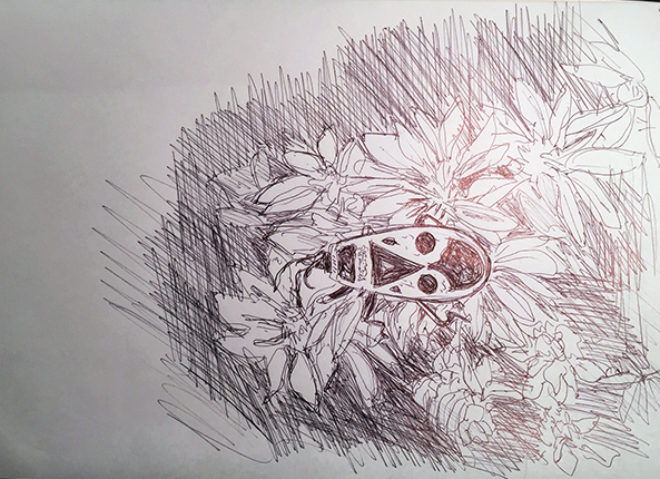 Feuerwanze auf kleiner Aster, schwarzer Kuli-roter Filzstift-Zeichnung, bei grauem Tageslicht fotografiert