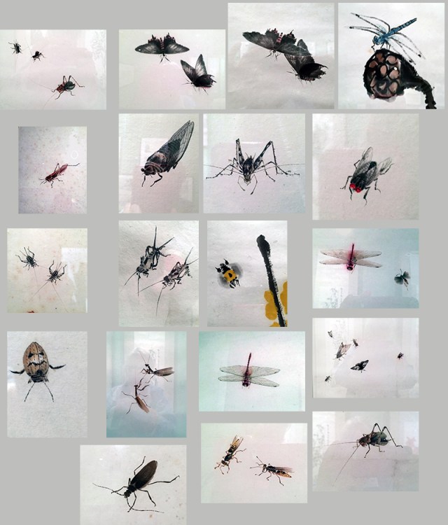 Und da kommt ein chinesischer Pinselmagier vom Anfang des vorigen Jahrhunderts daher und zaubert – natürlich ohne Fotovorlage – die allerfeinsten Insekten aufs Reispapier. Nicht nur Fliegen, nein, sondern vieles, was da so kreucht und fleucht. Der Meister möge es meiner westlichen Eile nachsehen, wenn ich all diese feinsten Wesen, denen er je eine große Fläche zuordnete, in Zeitraffermanier als Ausschnitte auf einem Blatt zusammenfasse.