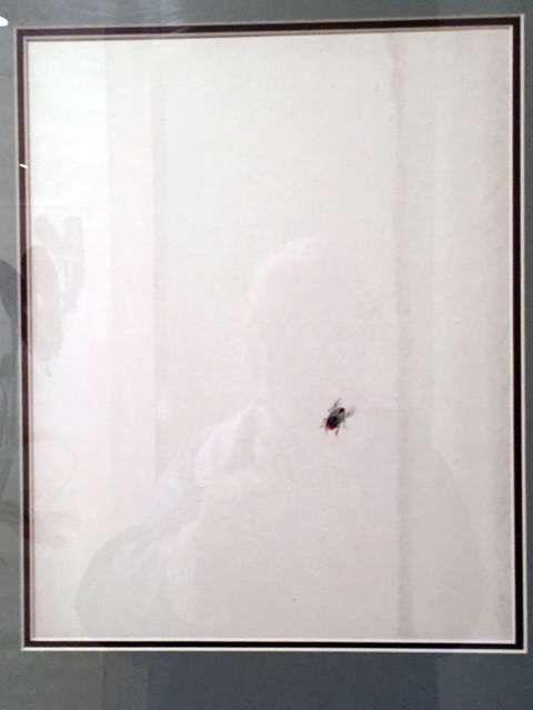 Leider kann ich das reine Weiß des Hintergrunds nicht ohne die schwache Spiegelung meiner Selbst zeigen. Auf diesem Weiß sitzt eine Fliege – in feinster traditioneller Weise draufgetuscht. Hier seht ihr sie herangezoomt.