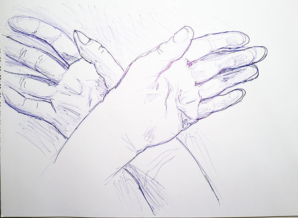 Die Idee war, die Handschale aufzulösen und die Hände als Flügel zu zeichnen, indem ich die Handgelenke kreuzte. Wieder gab es das Problem, dass ich immer nur die eine Hand sehen konnte, da die andere ja zeichnen musste. Das zwang mich, mir einige der Verhältnisse zwischen den Händen einzuprägen: Wo und wie treffen sie aufeinander, in welchem Winkel stehen sie zueinander, wie verschatten sie sich? Hinzu kommt, dass ich das Papier zum Zeichnen brauche, also die Hand immer mal ein wenig hin und herrücken muss. Auch das zwingt mich, mir meine Beobachtungen einzuprägen und jedenfalls für kurze Zeit mich zu erinnern: die Lebenlinie A und die Lebenslinie B treffen sich da und da….
