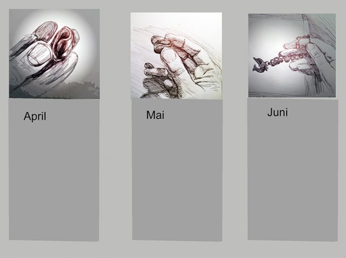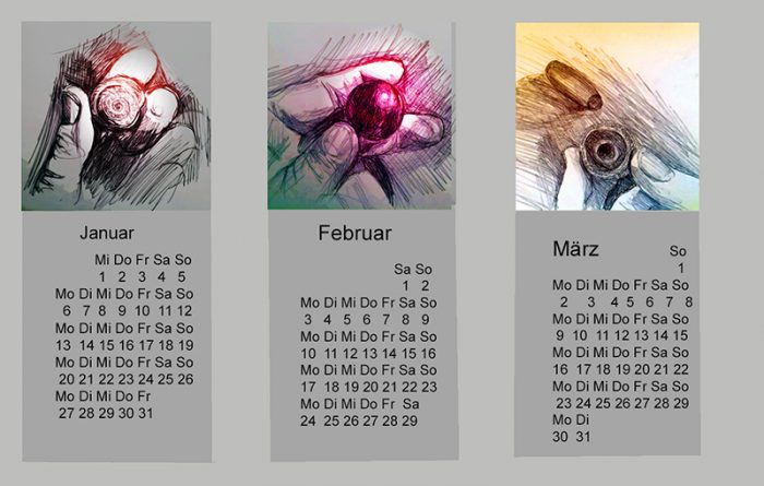 - Kalenderblatt mit Zeichungen der Serie „Kleine Dinge ans Licht heben“