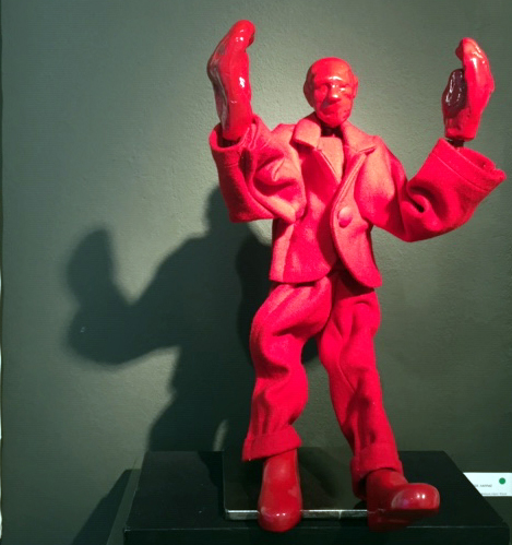 Durch die Vitrine erblickte ich als erstes einen der taumelnden knallroten „Kleinbürger“ von Giorgos Lappas, einem sympatischen verspielten Bildhauer und Hochschullehrer, der leider vor drei Jahren 66-jährig starb.