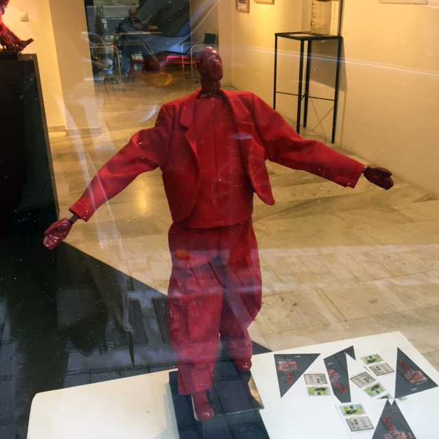Durch die Vitrine erblickte ich als erstes einen der taumelnden knallroten „Kleinbürger“ von Giorgos Lappas, einem sympatischen verspielten Bildhauer und Hochschullehrer, der leider vor drei Jahren 66-jährig starb.