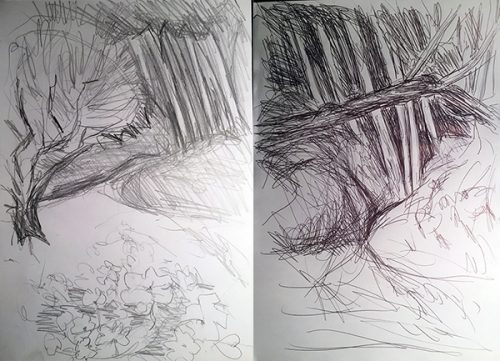 ← Mit Tito im Stadtwald, nachmittags. Fotos und tägliche Skizze, verglichen mit früherer Skizze.