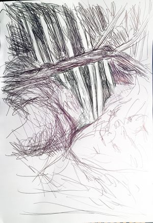 Mit Tito im Stadtwald, nachmittags. Fotos und tägliche Skizze, verglichen mit früherer Skizze.