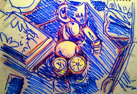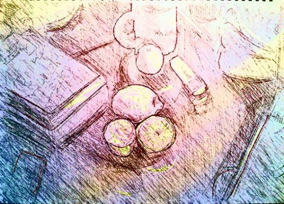 Die Früchte haben diesmal einen schweren Stand gegen die konkurrierenden Formen, von denen sie belagert werden. Also half ich ein wenig mit dem gelben Stabilo-Boss-Highlighter und dem roten Filzstift nach, die beide Teil des Stilllebens auf meinem Schreibtisch waren. Dadurch gab ich dem Mittelfeld mehr Kraft