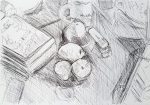 Und so wurde es eine kleine allerfeinste Reihe von Früchteleben auf Deinem Schreibtisch und eben lese ich, daß die Reihe eine fünfte Zeidhnung bekommen hat. Die werde ich mir später ansehen. Ich bin so sehr im Rückstand mit allen meinen Kommentaren, liebe Gerda…