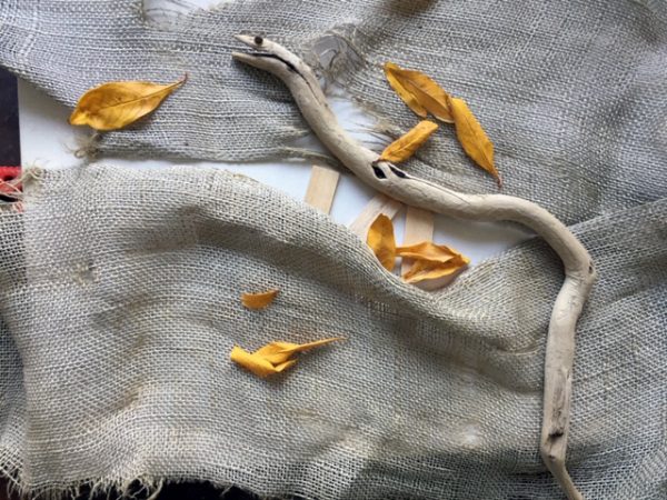 Holzschlänglein auf verschlissenem Tuch (Fotos, Zeichnung)