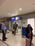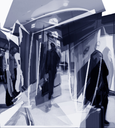 Die Szene mit den Ankommenden im Flughafengebäude hat mich weiter beschäftigt. Zunächst nahm ich mir das langweilige Foto vor, nach dem ich die zweite Skizze gemacht hatte. Ich entfärbte, zerschnitt und montierte es neu zu einer kalten Spiegelwelt, in der die Menschen sich wie Schemen bewegen.