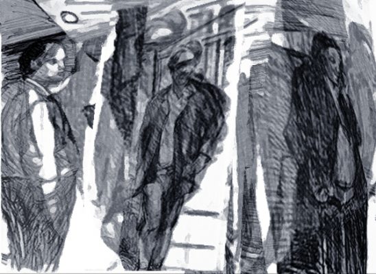 Dann probierte ich aus, wie sich diese Zerschneide- und Montagetechnik auf meine Zeichnung anwenden ließ. Durch die Raum-Brechungen und Einfärbungen werden verschiedene Bildeindrücke geschaffen. Besonders interessierte mich die Frage, wie sich veränderte Größenverhältnisse auf die Wahrnehmung auswirken würden. Daher vergrößerte ich die Figuren sukzessive: zuerst den Mann links, dann auch den in der Mitte, dann auch die Frau, schließlich noch einmal den Mann links. (Bitte die Einzelbider anklicken)