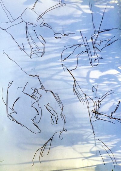 Noch einmal wollte ich tanzende Olivenbäume zeichnen und dachte, es wäre eine gute Idee, es mal mit dickem Filzstift zu versuchen. Es ging mir darum, die Bewegung grob festzuhalten. Und da jeder Baum anders ist, wollte ich mehrere schnelle knappe Skizzen machen.