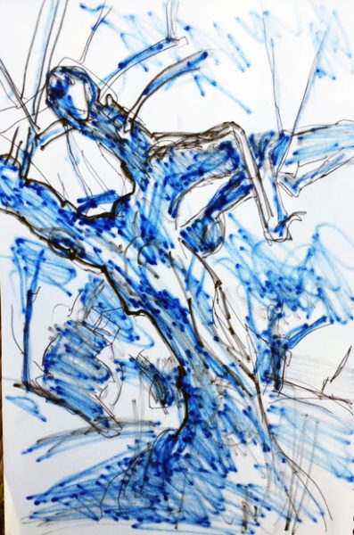 Die 2. Bearbeitung, auch mit schwarzem Kugelschreiber, zeigt einen einen Koloss von Baum, dessen Tanz wieder anders ist. Seine Schritte werden hallen, wenn er sich stampfend bewegt, dagegen wirkt der Nymphenbaum geradezu grazil. Doch das Kraftvolle zeigen sie beide, es drückt sich nur unterschiedlich aus.