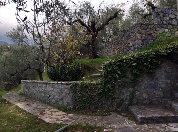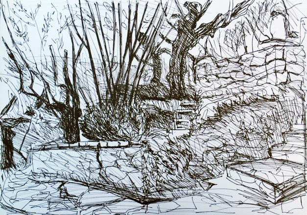 Ein schwieriges Thema mit vielen Kleinstrukturen nahm ich mir heute vor. Es gab auch ein paar Ölbaumstämme als dunkle Akzente. Von Anfang an war klar, dass ich nicht ins Detail gehen konnte, denn zeichne mal hunderte von Blättern, zig Bruchsteine und Steinplatten, so und so viele Stämme und Stämmchen im Vorder- und im Mittelgrund. Selbst wenn es sich nicht zugezogen hätte – es donnerte sogar – , hätte es meine Geduld überfordert.